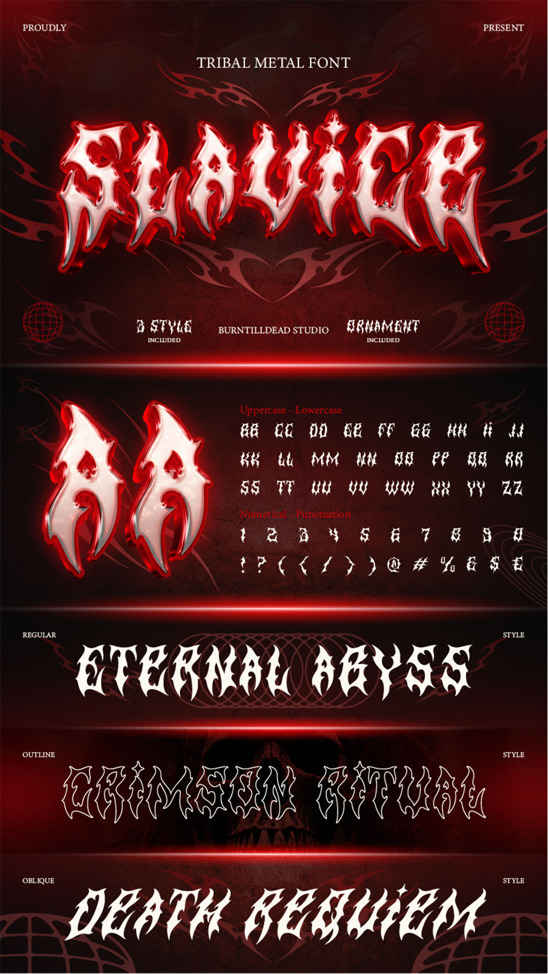 Slavice, a tribal metal font ready to break the limits of your creativity. Designed with sharp details and wild curves, Slavice blends chaos and aesthetics into one brutal, aggressive, and masculine package. Its fierce, spiky form is heavily inspired by the iconic look of tribal tattoos. This font comes in 3 styles: Regular, Outline, and Oblique – plus 2 tribal ornament styles: Regular & Outline. Slavice is made for design projects with dark, gothic, horror, underground music themes, band merchandise, gig posters, tattoo designs, and anything that craves bold and intense energy.