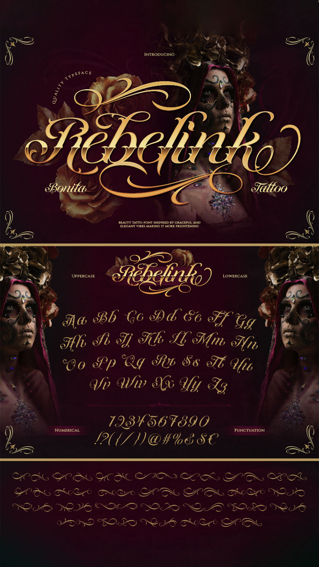 Rebelink, a beautifully crafted script tattoo font with a touch of blackletter and baroque flourish. The letterforms are flowing with sharp contrast in strokes and dramatic swashes, giving it an elegant and theatrical look. With a wide range of stylistic alternates, Rebelink is easy to customize and perfect for exploration in creative projects. Best used for display purposes such as tattoo studio logos, band/album covers (metal or Latin rap), or any design with a gothic or Latin-inspired theme.