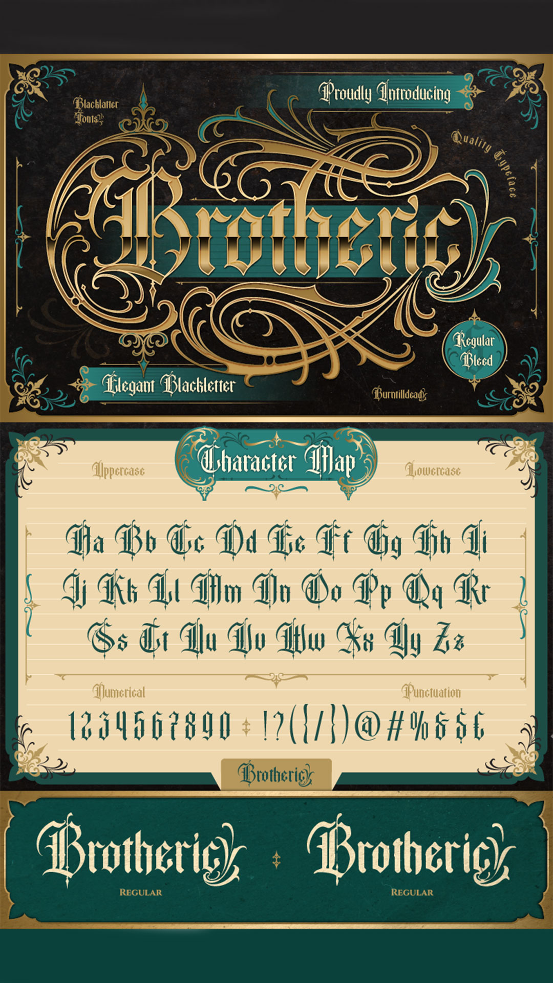 Brotheric, an elegant and ornamental blackletter font. A beautiful blend of classic European forms and modern editorial style. Designed with strong letterforms and sharp angles, this font stays readable—even for longer texts. Brotheric brings a majestic and timeless feel, perfect for designs that aim for a “luxury meets vintage” aesthetic. It belongs to the gothic family, but with a refined tone that makes it versatile for many design styles. Ideal for tattoo designs, packaging, heritage branding, experimental magazine headlines, and music posters.