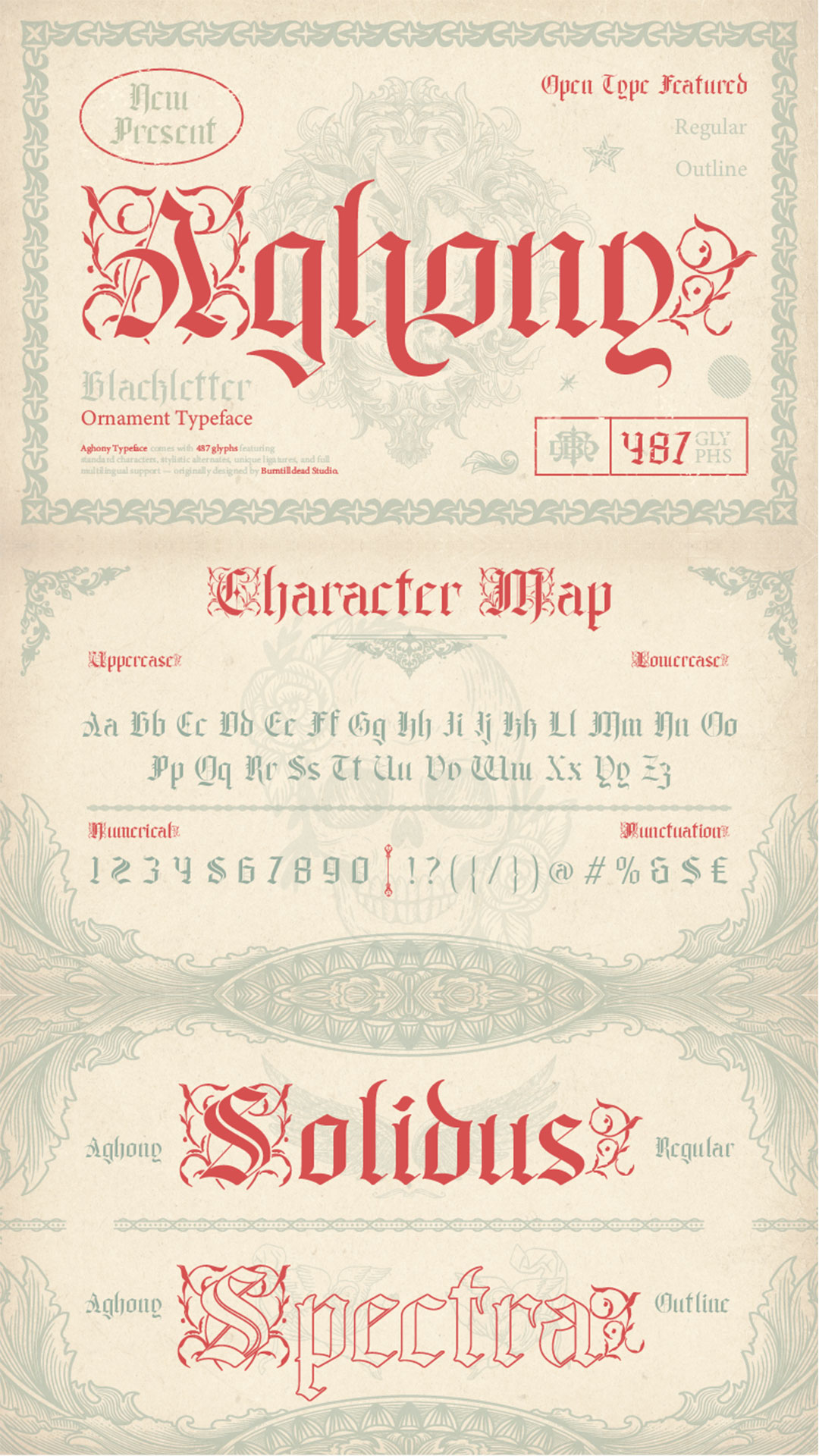 Aghony, an artistic blackletter font with ornamental touches on each letter. This font brings an elegant yet dark atmosphere, taking you back to the medieval era with a modern and expressive twist. Aghony comes in two styles: Regular and Outline. The outline style is perfect for designs that need a lighter look while still keeping a bold visual presence — ideal for posters or large headers. Perfectly suited for themes like medieval/gothic, tattoo art, metal/hardcore album covers, vintage posters, or occult-inspired visuals.