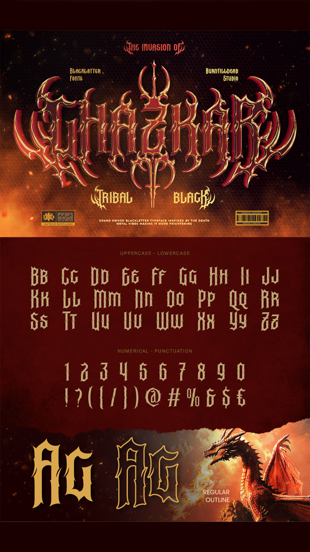 Ghazkar, a sharp and dominant tribal blackletter typeface. This font features unique character details through extra elements like spikes, thorns, and vine-like motifs that blend seamlessly with its letter structure. Ghazkar comes in two styles: Regular and Outline, equipped with a wide range of ligatures and alternates to let your wild creativity flow freely. With its bold gothic style, this font is a solid choice for dark fantasy themes, heavy metal designs, tattoo artwork, gothic horror, or any branding that demands power and visual dominance. Feel the visual power of Ghazkar and let your design speak with untamed energy.
