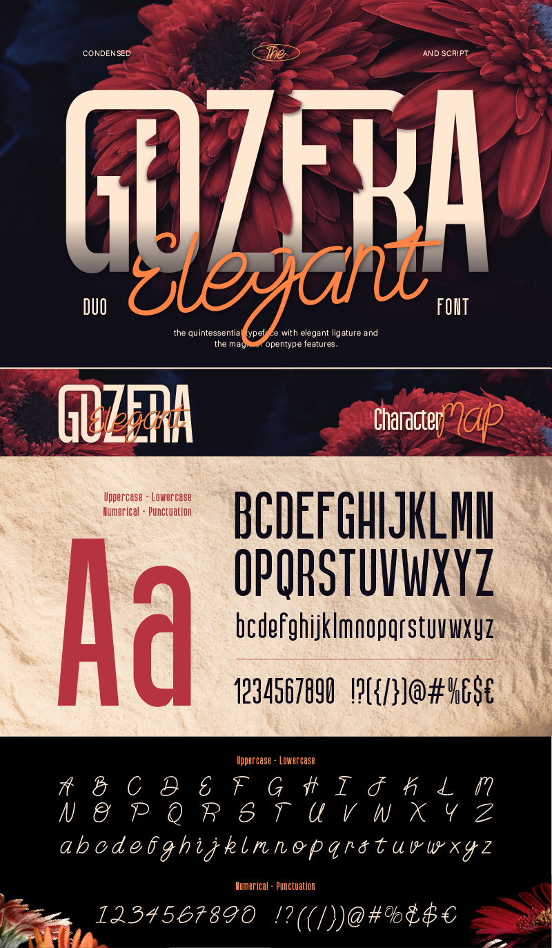 Introducing Gozera, a stunning font duo that combines two contrasting yet perfectly balanced styles: a modern condensed sans serif and an elegant handwritten script. This unique pairing gives you the freedom to create bold, dynamic designs with a sophisticated touch.