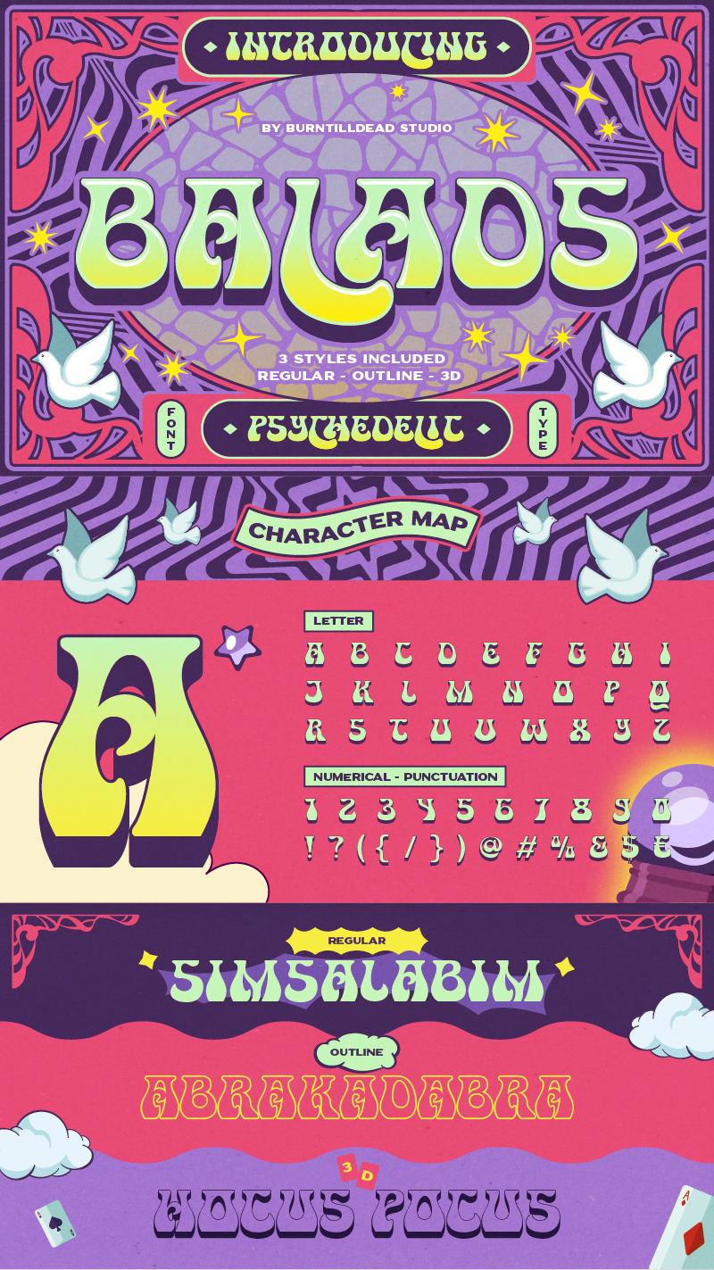 Balads is not just a font—it’s a vibe. A little wild, a little weird, and a whole lot of wonderful. Whether you’re working on posters for summer music festivals, indie band merchandise, album covers, editorial layouts, or quirky creative artwork, this font gives your project that retro, hippie, and magical touch.