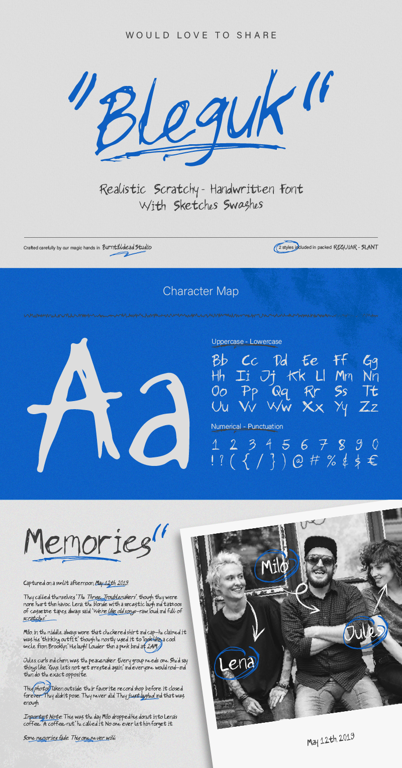 The scratchy texture gives it that real, handmade feel, like using a marker or pen on random paper. Bleguk comes in 2 styles: Regular and Slant, so you can mix things up depending on your vibe.