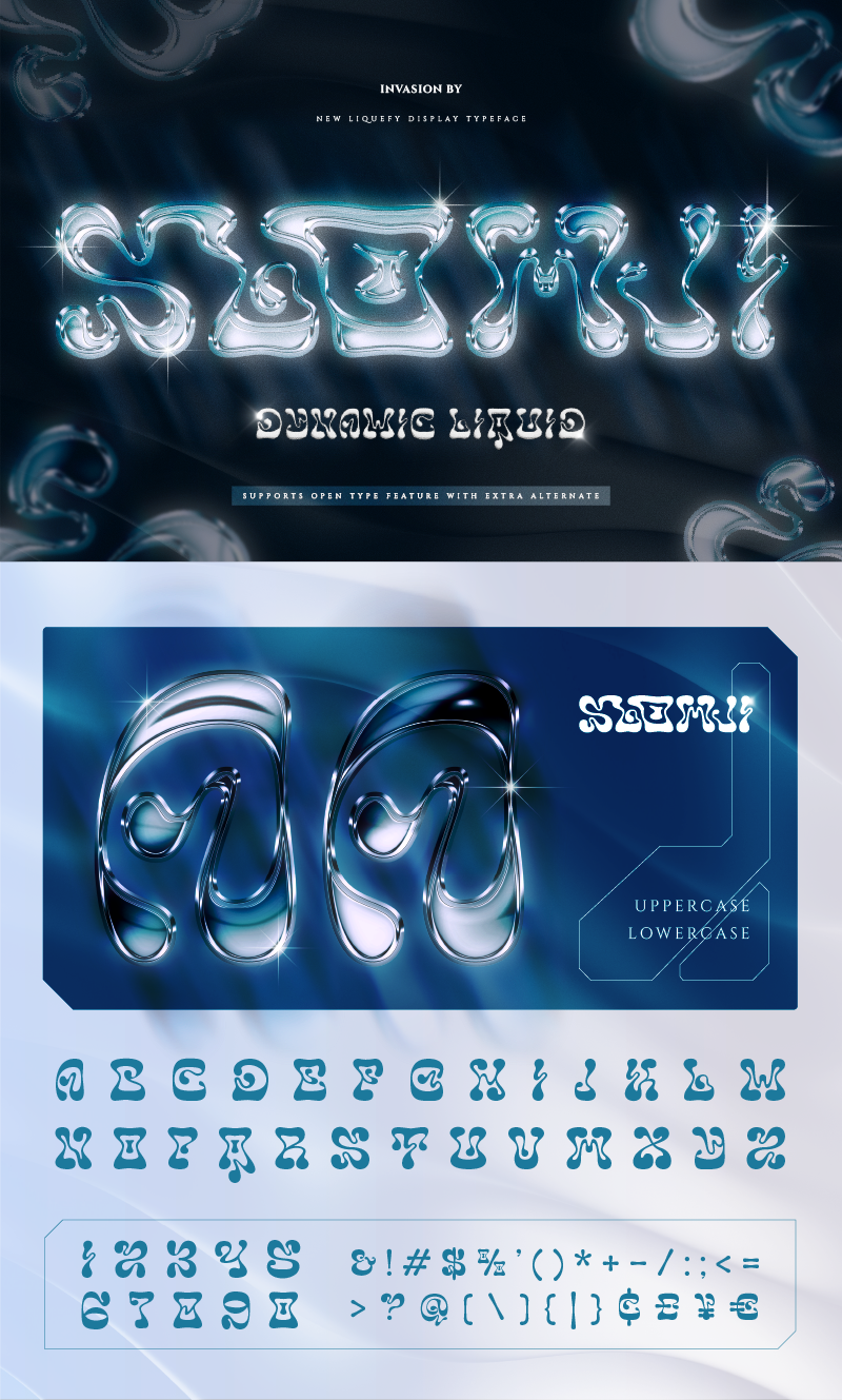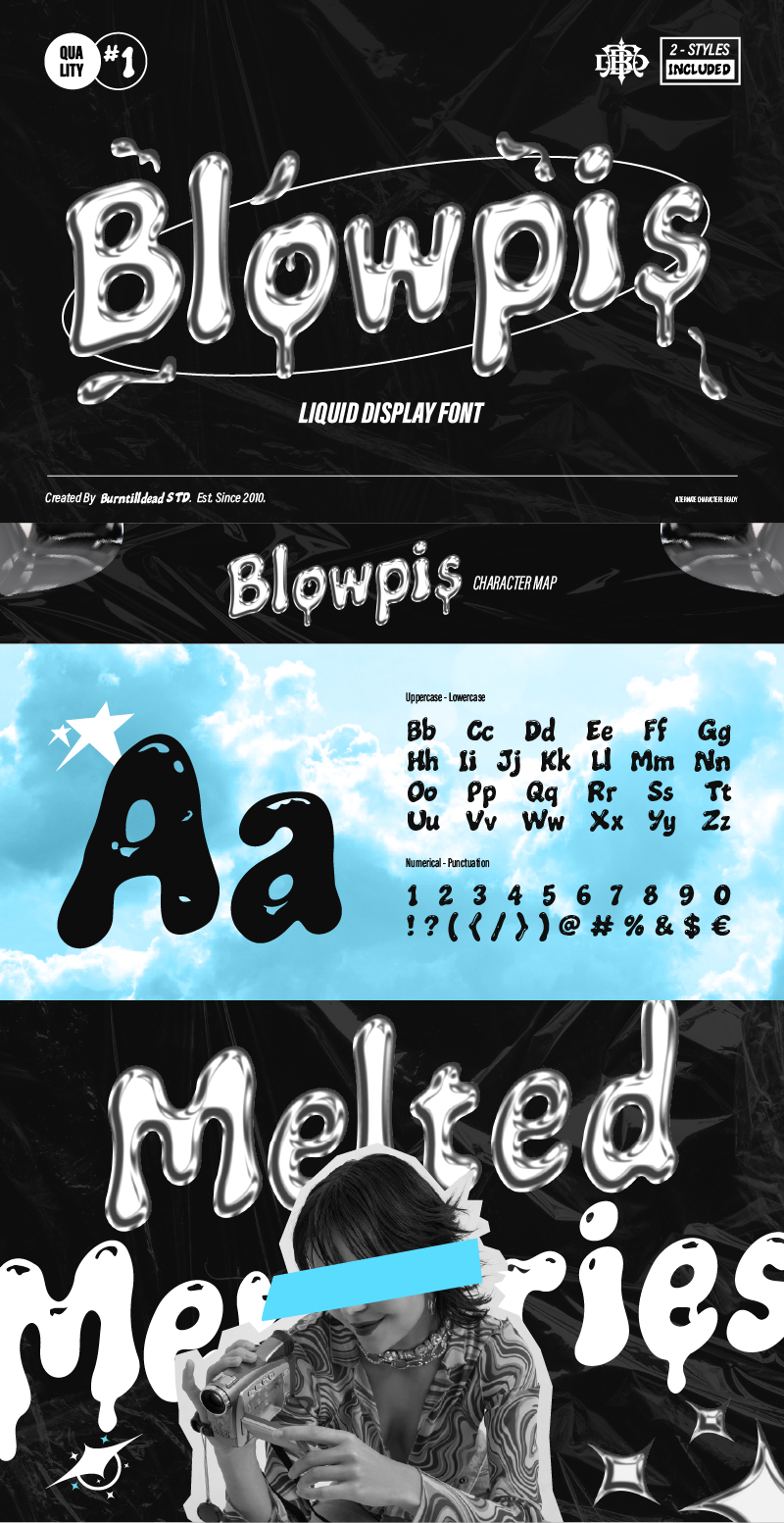 A playful and edgy display font that melts the ordinary. Inspired by dripping textures and bubbly shapes. It comes in 2 unique style: Regular and Solid. Regular style crafted with fun highlight effects to add depth and make your letters pop in a playful way. And Solid style, No highlights, just bold and chunky! Great for punchy headlines and loud visual statements. Blowpis includes cool alternates that turn your letters into bubble-like blobs, liquid drips, or even creepy horror vibes. Just mix and match! Best fot music & event posters, streetwear design, album covers, Y2K vibes oe even experimental layouts. Blowpis brings a fresh vibe to your design, perfect for those who love to stand out!