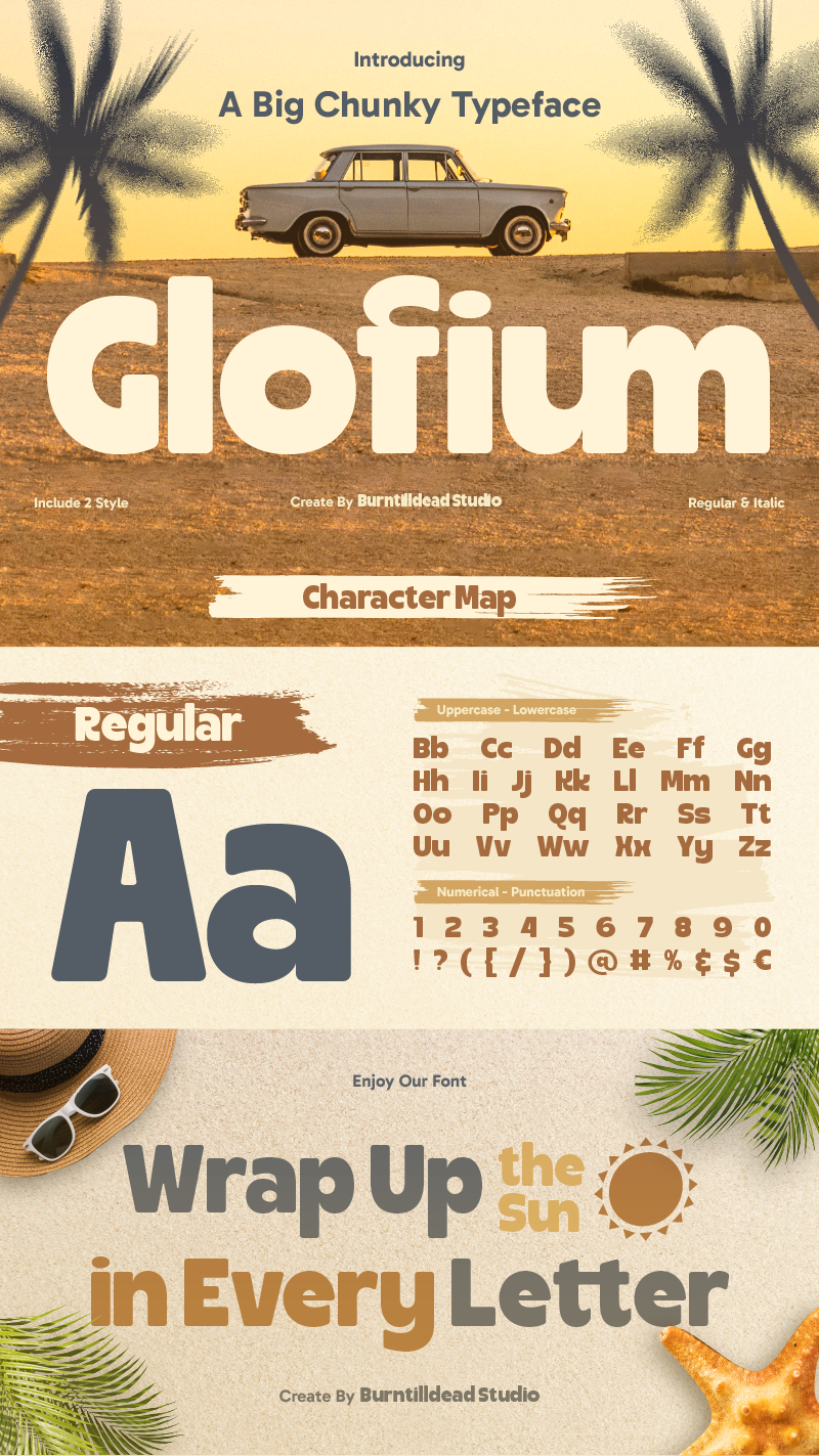 Bold and chunky typeface that’s super fun to use and easy to read. It comes with 2 styles: Regular dan Italic, so you can mix things up and keep your design looking fresh. This font have characterize of warm, friendly and impossible to ignore. If you’re working on a poster, branding project, social media post, poster, big headlines, product packaging or just want your words to stand out, Glofium got your back! The shapes are thick, rounded and friendly – making your text look bold but still super easy to read.