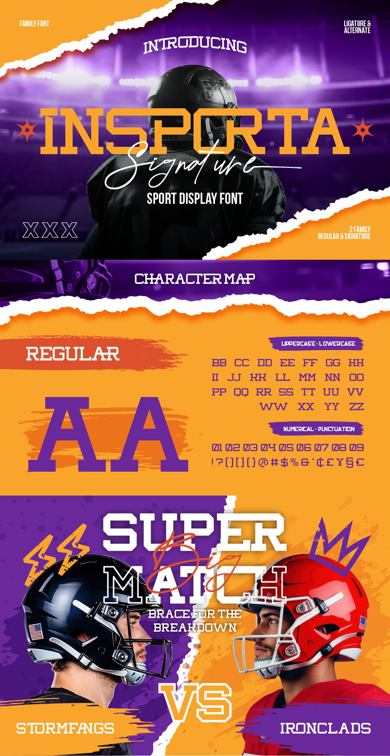 A bold and energetic font duo designed to bring the spirit of competition into every design. This sporty typeface combines a strong all-caps serif font that inspired by college varsity aesthetic with a stylish signature script. Perfect for sports branding, athletic posters, team logos, or game day merchandise, Insporta Signature combines modern varsity typeface vibes with a personal, handwritten touch. Whether you’re designing for a football match, a college event, or a fitness brand, this sports team font has got you covered. With its classic varsity vibe and modern handwritten twist, Insporta Signature delivers a “game day ready” look that stands out.