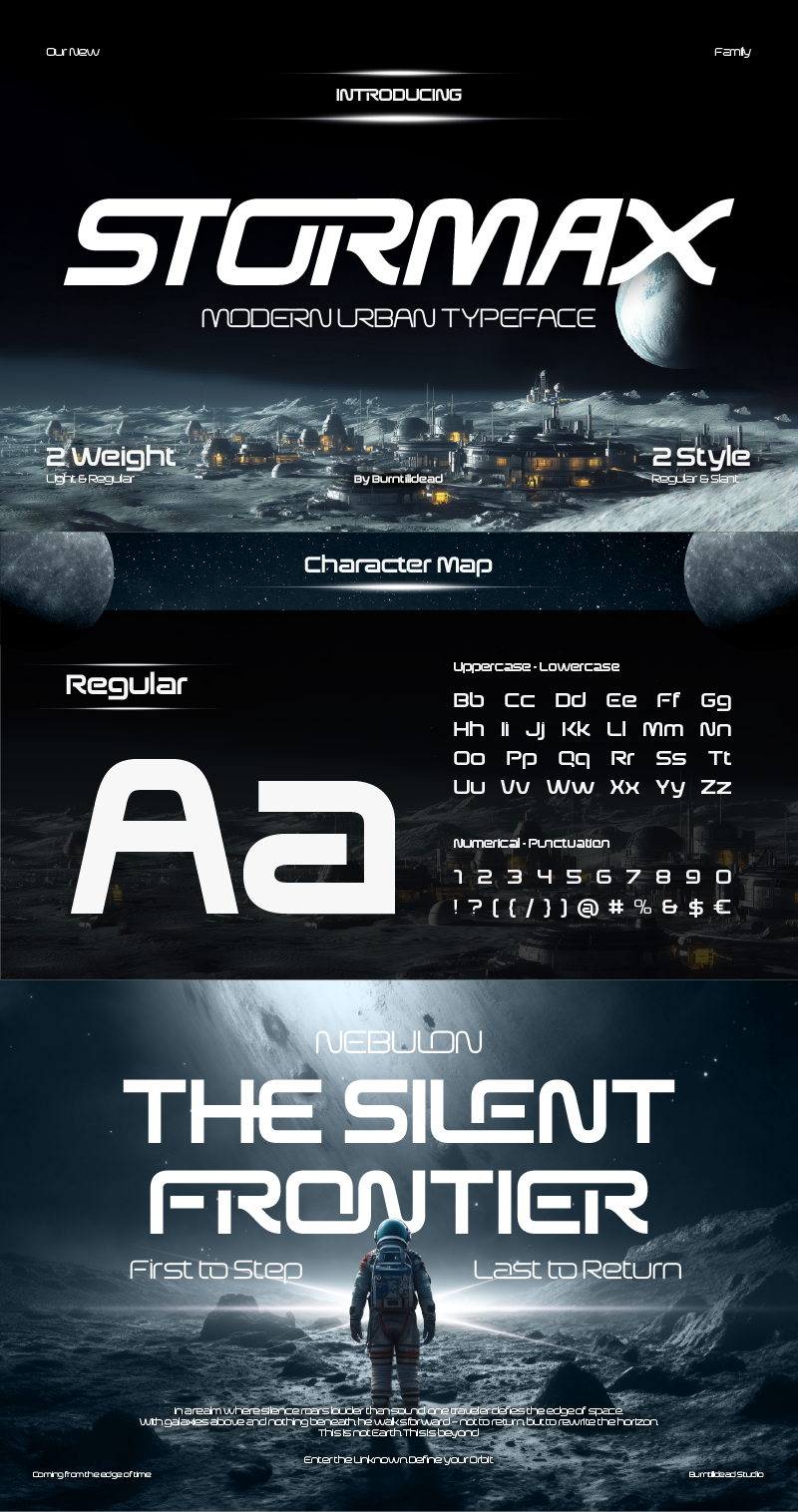 Takes you to the future, a bold sans serif typeface with high tech and futuristic aesthetics. Featuring 4 Styles: regular, slant, light and light slant. Stormax offers the flexibility dan dynamic options for any design. With its powerful alternates dan ligatures. this font is crafted for creators who dare to push boundaries, perfect for sci-fi poster, space theme branding, innovative tech startup, gaming interfaces and beyond.