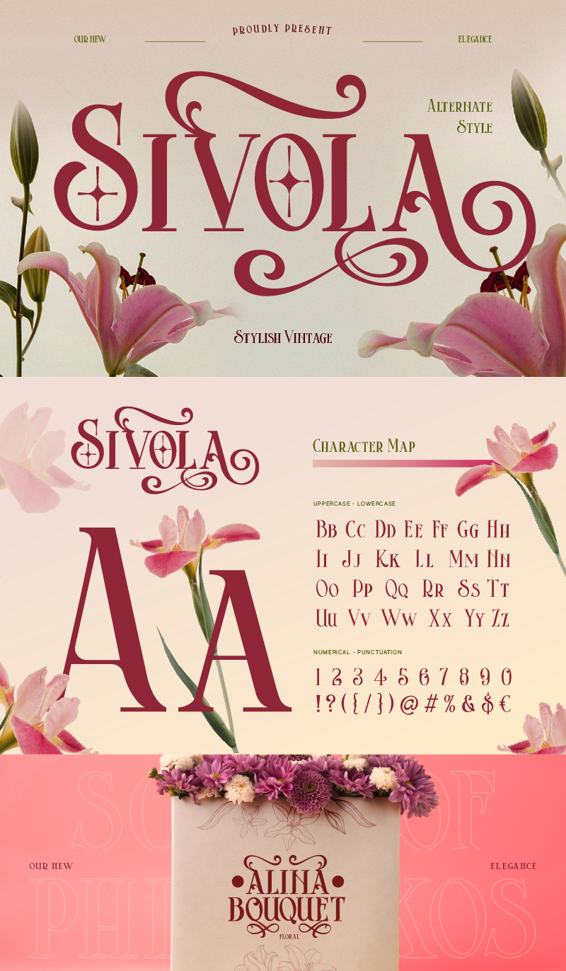 A stylish serif font with elegant curves and vintage charm. Designed with plenty of alternates and decorative ligatures, it offer unlimited creative possibilities. Whether you’re crafting a logo, poster, or editorial design, Sivola adds a luxurious and eye catching flair that make your design stand out. With its stylish swashes and classic letterforms, Sivola is one of a kind font for any creative project.