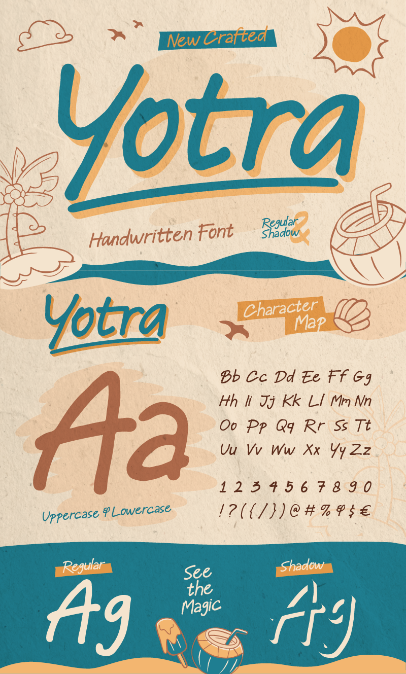 A fun and expressive handwritten font that brings a fresh breeze of creativity into design. This font comes with 4 playful sytles: regular, shadow, graphic regular and grahic shadow. Each style is crafted to maintain a casual, handcrafted feel while ensuring legibility and visual charm. Yotra’s slightly messy yet balanced strokes create a lively and humanistic rhythm—making it perfect for posters, packaging, quotes, children’s books, summer-themed projects, and anything that needs a touch of fun.